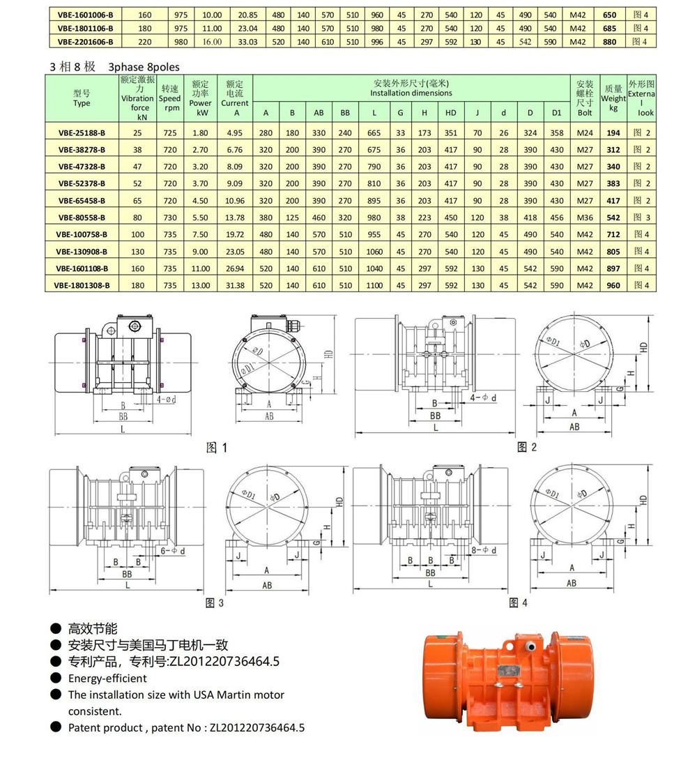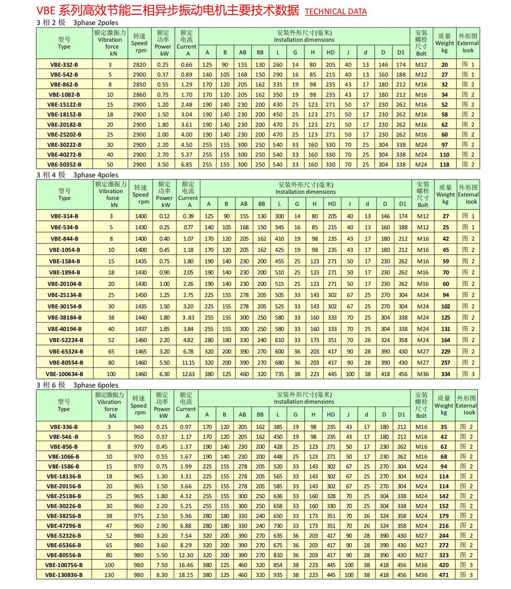 VBE系列高效节能三相异步振动电机运用大量新技术、新工艺、新材料,具有高效节能,其效率高于国家标准2~2.5个百分点,安装尺寸与  VBE系列高效节能振动电机国际接轨,与美国马丁公司电机安装尺寸完全一致。全系列电机体积小、重量轻、外型美观,综合性能远优于国内同类产品的综合优势。