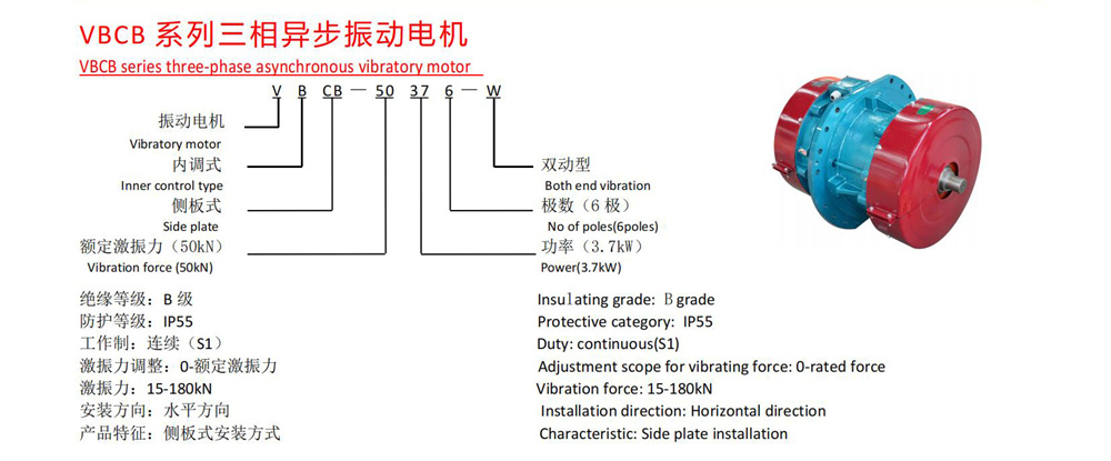 VBCB系列三相异步振动电机是我公司自主开发的新产品,拥有自主知识产权,受国家法律保护。与普通振动电机相比,它省去了振动机械复杂的电机底板    VBCB系列振动电机结构,电机直接安装在振动机械的侧板上,可使振动机械实现圆运动或直线运动,同时可使振动机械重量减轻,机体刚度要求减小,减少振动机械的能耗,安装维护方便、单机激振力大、寿命长(达10000小时)。它广泛运用于电力、建材、煤炭、化工、矿山、冶金、轻工、铸造等行业,主要适用于大型筛分设备,由于其独特的特点,可逐步替代轴偏心、块偏心等其它类型的激振源,同时为我国大型振动机械提供了新型、可靠的激振源。